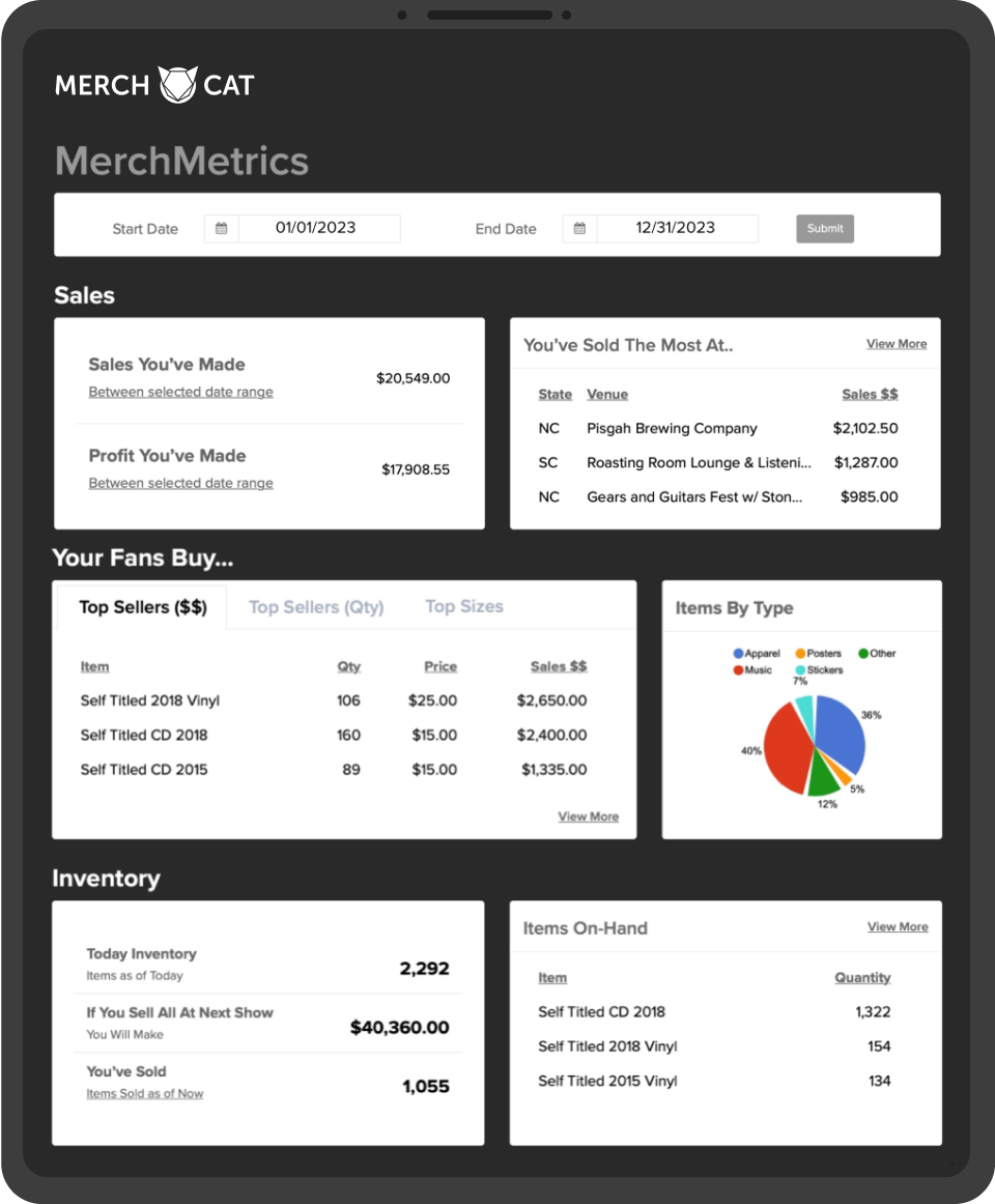 Our MerchMetrics analytics dashboard empowers you to easily make merch decisions backed by data.